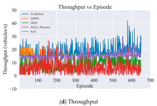 As shown in Figure 11b–d, the G-DESAC model consistently outperforms other algorithms in terms of total delay time, queue length, and throughput in single intersection traffic control. Total delay time: G-DESAC significantly reduces vehicle waiting times, achieving the best control effect in this metric. Queue length: The algorithm maintains the lowest queue length, successfully preventing traffic congestion. Throughput: G-DESAC improves the throughput rate at the intersection, optimizing the flow of traffic. Although the total latency and queue length of G-DESAC were slightly higher than SAC after 600 rounds of training, they were again lower than SAC around 650 rounds. In addition, G-DESAC demonstrates high stability, with minimal fluctuations during training, maintaining consistent performance as training progresses. In contrast, algorithms like Max-Pressure, DQN, DDPG, and SAC exhibit relatively poor performance, particularly in delay time and throughput control. These results suggest that G-DESAC has significant potential for real-world traffic signal control applications.