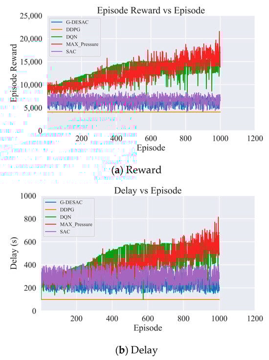Figure 11a shows the total reward evolution of five algorithms across different training rounds in a single-intersection scenario. G-DESAC demonstrates clear superiority, with a steady increase in reward after initial fluctuations, particularly after 600 rounds, where its performance surpasses all other algorithms. This reflects G-DESAC’s strong learning ability and optimization effectiveness. In contrast, DQN shows good early performance but experiences significant fluctuations and a downward trend later in the training. SAC (purple line) remains relatively stable around a reward value of 1000, without much improvement. Max-Pressure Control exhibits the largest reward fluctuations, indicating instability and weaker overall performance. DDPG shows little variation, suggesting that it may be stuck in a local optimum and unable to explore adequately or further optimize the strategy. In summary, G-DESAC not only outperforms the other algorithms in the later stages but also shows better stability and consistent improvement, demonstrating the best traffic signal control performance in the single-intersection scenario.