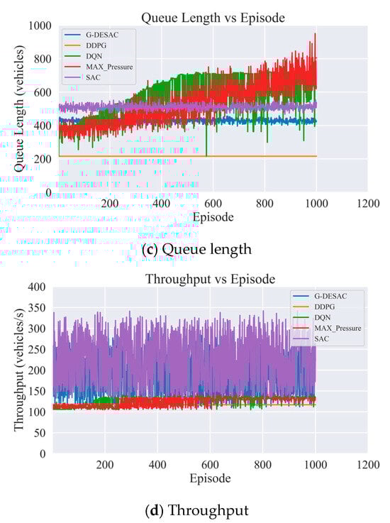 Based on the relative percentage differences in Table 5 and Table 6, G-DESAC significantly outperforms the alternative algorithm on several key performance indicators. In the single intersection scenario, the delay and queuing length of DDPG are lower than those of G-DESAC, because DDPG falls into local optimization and insufficient exploration in the training process and fails to further optimize the strategy, and its throughput is 9.73% lower. DQN has a 740.84% higher latency, a 305.52% increase in queue length, and a 51.17% decrease in throughput. MAX Pressure and SAC are also significantly inferior to G-DESAC in latency and queue length, especially MAX Pressure’s latency, which increased by 1090.43%, and throughput decreased by 65.01%.