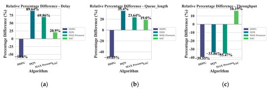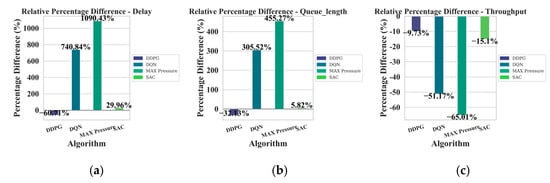 In order to quantitatively show the advantages of the proposed method over alternative methods, Table 3 and Table 4 summarize the average metrics for each algorithm. In addition, the relative percentage differences in performance indicators between the deep reinforcement learning method and other methods in this paper are shown in Table 5 and Table 6. A negative value indicates that the alternative method is lower than G-DESAC on the “throughput” metric, while a positive value indicates that the alternative method is performing poorly (higher latency and queue length) for the “delay” and “queue length” metrics. At the same time, the calculation results of the relative percentage difference (based on G-DESAC) are displayed in the form of a graph to facilitate visual comparison, as shown in Figure 13 of the relative percentage difference of the single intersection and Figure 14 of the relative percentage difference of the twelfth intersection.