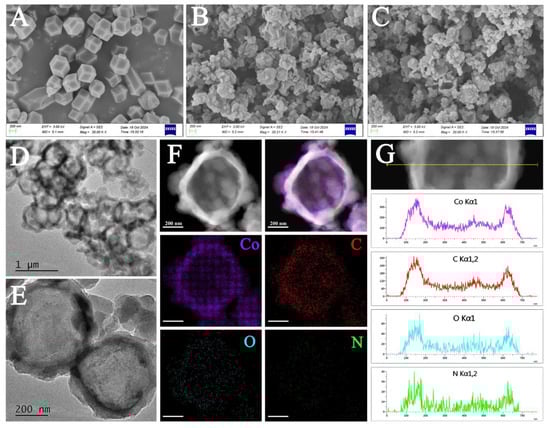 Morphological characterization of ZIF-67@PDA-MIP. SEM image of (A) ZIF-67, (B) ZIF-67@PDA-NIP and (C) ZIF-67@PDA-MIP; (D,E) TEM image of ZIF-67@PDA-MIP; (F) EDS elemental map of ZIF-67@PDA-MIP; (G) ZIF-67@PDA-MIP distribution curves of different elemental content variations in the same MIP region.