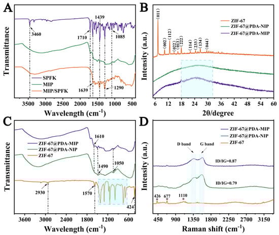 (A) FT-IR spectra of ZIF-67@PDA-MIP before and after SPFK adsorption; (B) XRD patterns, (C) FTIR spectra and (D) Raman spectra (The characteristic Raman peaks of ZIF-67 are marked with *) of ZIF-67, ZIF-67@PDA-NIP and ZIF-67@PDA-MIP.