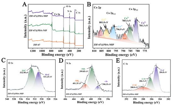 XPS profiles of ZIF-67, ZIF-67@PDA-NIP, and ZIF-67@PDA-MIP. (A) XPS total spectrum, (B) Co 2p, (C) C 1 s, (D) N 1 s and (E) O 1 s spectras of ZIF-67@PDA-MIP.
