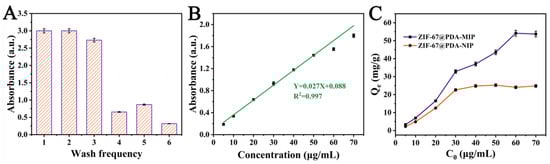 SPFX was selected as the target molecule to examine ZIF-67@PDA-MIP’s adsorption characteristics. Anhydrous ethanol served as the eluent, and the elution degree was quantified by measuring the decrease in UV absorbance at 298 nm (Figure 4A). A calibration curve was constructed using varying concentrations of SPFX standard solution (0.5–70 μg/mL), yielding a linear regression equation of y = 0.027x + 0.088 with a high correlation coefficient R2 = 0.997 (Figure 4B). The isothermal adsorption experiments, illustrated in Figure 4C, demonstrated that the adsorption capacity of both ZIF-67@PDA-MIP and ZIF-67@PDA-NIP increased with rising SPFX concentrations. Initially, the equilibrium adsorption capacity grew slowly, with MIP consistently exhibiting a higher adsorption capacity for SPFX compared to NIPs until saturation was reached. When the adsorption process starts, the equilibrium capacity increases gradually, with the adsorption capacity of MIP for SPFX consistently outperforming that of NIP until saturation is achieved. At lower concentrations, ZIF-67@PDA-MIP demonstrated an impressive equilibrium adsorption capacity of 54.15 mg/g, significantly exceeding that of ZIF-67@PDA-NIP, which recorded 25.16 mg/g.