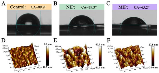 MIP-QCM chip characterization contact angle on the chip surface of (A) a bare chip, (B) NIP and (C) MIP. AFM 3D view of the chip surface of (D) a bare chip, (E) NIP and (F) MIP.