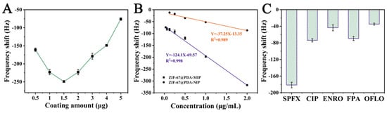 Appropriate amounts of SPFX standard solutions of different concentrations (all lower than those required for adsorption saturation) were added dropwise to the surface of the MIP-QCM and equilibrated at room temperature for ten minutes. Unbound SPFX was washed away with deionized water, the chip was dried, the frequency change was measured, and a frequency–concentration linear curve was plotted. Selective analysis was performed through the dropwise addition of equal amounts of CIP, ENRO, FPA, and OFLO standard solutions of the same concentrations on the surface of the MIP-QCM, with the same experimental steps as above.