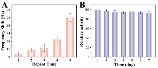 The reproducibility and stability of the MIP-QCM were determined (Figure 7). Regarding repeatability, after five cycles of repeated elution, we observed a gradual decrease in the frequency of the membrane. Specifically, the frequency difference between the fifth elution and the initial frequency exceeded 50 Hz. This decline may be due to small parts of the membrane detaching during the repeated ultrasonication process. As for stability, the sensor demonstrated good performance, with stability remaining above 95% after one week.