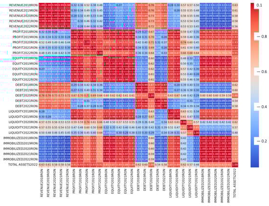By using Python 3.11.0 and the “seaborn” library, the authors intended to compute the heatmap of the correlation matrix, including total assets, revenue, number of employees, profit, debt, equity, and liquidity, between 2018 and 2022. Before this step, they checked for the lack of missing values; searched for outliers; checked data distribution; evaluated consistency across years; searched for zero or negative values; and finally, calculated correlations. By using the interquartile range (IQR) method computed by using Python 3.11.0, 733 outliers in the revenue data for 2022 were found. These outliers were identified as being significantly higher than the typical revenue values in the dataset. Data distribution was not illustrated as being normal but rather skewed to the left, indicating that most companies have relatively low revenue values, with a few companies having very high values. The consistency of revenues and profit across years was evaluated by detecting the presence of zero or negative values. Afterward, all these values were cleaned, and year-over-year growth rates were calculated.