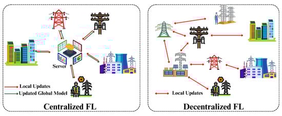 To address the aforementioned issues, Federated Learning (FL), introduced by H. Brendan McMahan in 2017 [21], presents a promising solution for decentralized computing that emphasizes privacy by shifting model training to the data owners. In FL, data remain localized, allowing multiple devices or entities to collaborate on model training without transferring their data to a central repository [22]. FL can be categorized into centralized and decentralized approaches, each with distinct characteristics and use cases. CFL relies on a central server to coordinate model updates, while DFL involves direct peer-to-peer communication among clients [19] as depicted in Figure 1. For load forecasting, FL can be particularly effective. It ensures privacy while maintaining high forecasting accuracy by training models across decentralized data sources, such as smart meters, without sharing raw data [23]. For example, FL can be applied to short-term residential load forecasting, achieving comparable accuracy to centralized methods with reduced computation and enhanced privacy.