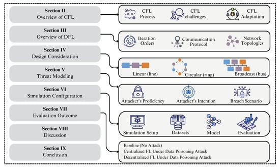 The remainder of this paper is organized as follows (Figure 2): Section 2 examines the distinctions between CFL and DFL, addressing the challenges faced by CFL and its adaptations. Section 3 explores the essential design elements of DFL, including iteration order, communication protocols and network topologies. Section 4 further discusses considerations for DFL design. Section 5 presents the threat modeling framework, while Section 6 outlines the simulation environment, datasets, architectural paradigms and evaluation criteria. Finally, Section 7, Section 8 and Section 9 discuss the evaluation results, comparing the performance of CFL and DFL under data poisoning attacks, and conclude with a summary of the findings.