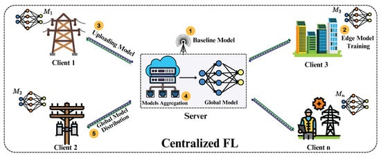 Recent advancements in technology and data generation have transformed the power grid, compelling utilities and operators to revise their forecasting strategies [11]. Energy service providers can leverage artificial intelligence (AI) to analyze extensive datasets effectively. By employing sophisticated machine learning (ML) models, they can enhance consumption predictions, optimize profitability and anomaly detection, and conduct pattern analysis without explicit directives [12,13]. Although approaches that involve collecting vast amounts of data on central servers [14,15] enhance adaptability and accuracy, they can lead to several critical issues. Privacy risks are a significant concern, as aggregating data from various sources into a central repository increases the likelihood of data breaches and unauthorized access [16]. As data collection grows, the responsible management of sensitive information becomes increasingly important. Recent incidents of data leaks have highlighted the privacy risks inherent in traditional forecasting methods used on edge devices. This vulnerability stems from the common practice in conventional ML approaches of uploading sensitive data to the cloud for model training [17]. Energy consumption data, in particular, can reveal personal details, such as periods of absence or sensitive production information, that malicious actors can exploit [18]. This centralization poses data ownership and control issues, as data-sharing reluctance arises from fears of misuse [19], stalling collaboration. GDPR and similar regulations further complicate cross-border data storage [20]. Centralized models often lack the diversity of decentralized data, reducing robustness. Additionally, transferring large datasets is both time intensive and costly in bandwidth and resources.