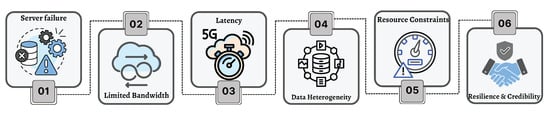 In CFL, the central server bears numerous responsibilities and encounters various challenges, typically addressed by large organizations with significant resources. However, as the client base expands indefinitely, new concerns regarding scalability and resilience arise [43]. Key issues as shown in Figure 4 include the following: