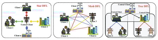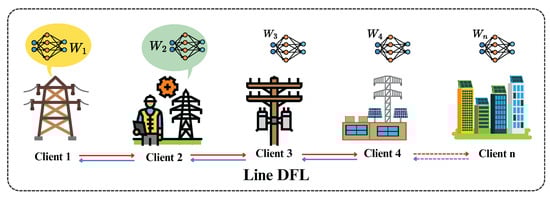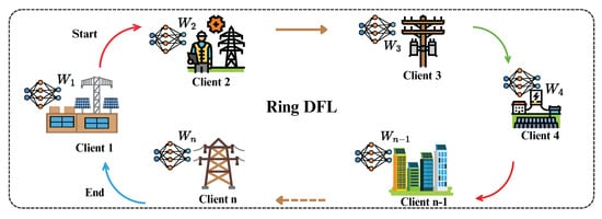 DFL removes the need for a central server, allowing clients to communicate and share model updates directly with one another. This method improves resilience and privacy by eliminating a single point of failure and a central data repository [55]. However, DFL necessitates more complex coordination protocols and iteration order to effectively manage peer-to-peer communications [56,57].
