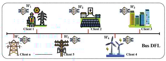 Figure 7. Visual representation of DFL bus topology. - Ring topology: Clients communicate in a cyclic manner, forming a closed loop [66]. Each client connects to exactly two others as shown in Figure 8, with data traveling in one direction around the ring, ensuring that each client has an equal opportunity to communicate.