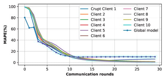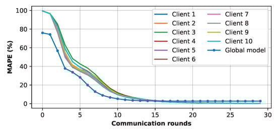 Steps 2–4 are iterated several times, as FL generally require multiple rounds to converge. At the conclusion of each round, clients assess the model’s performance using metrics like Mean Absolute Percentage Error (MAPE) and send updates to the server.
