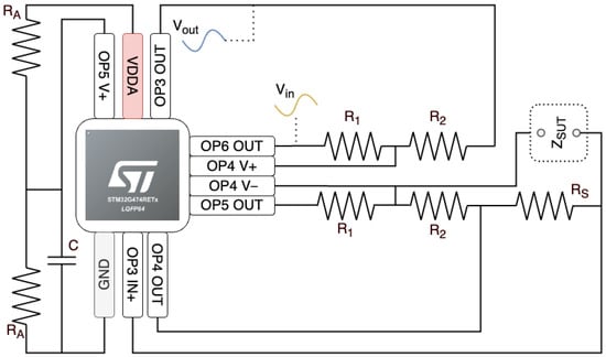 where is the signal generated by the microcontroller through a DAC peripheral and is the voltage generated across when current flows through. and are matched resistors to guarantee appropriate electrical symmetry, and the injected amplitude of the current signal can be controlled by the DAC signal and the value .