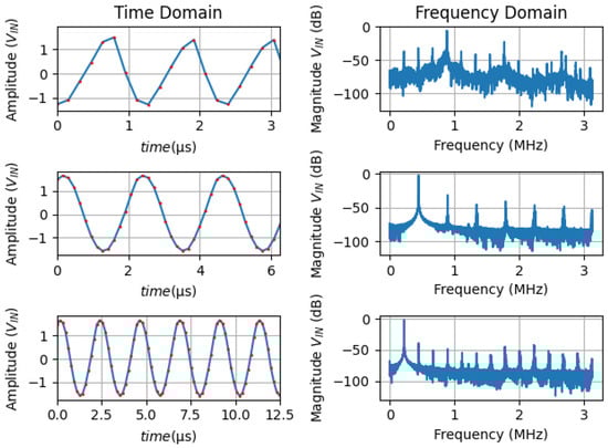 Figure 3, Figure 4 and Figure 5 illustrate results from the DAC signal generated. Spectral leakage is observed along the frequency domain due to the DAC update frequency. Larger LUT sizes result in crest factors closer to the ideal value, corroborating the observation that these configurations produce cleaner, more sinusoidal signals. This alignment is crucial for impedance spectroscopy applications, where accurate signal reproduction is essential for reliable impedance measurements.