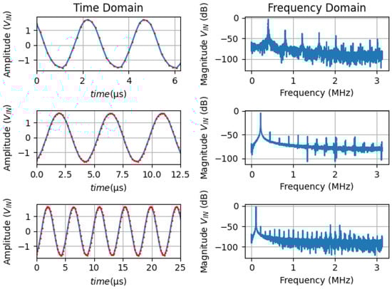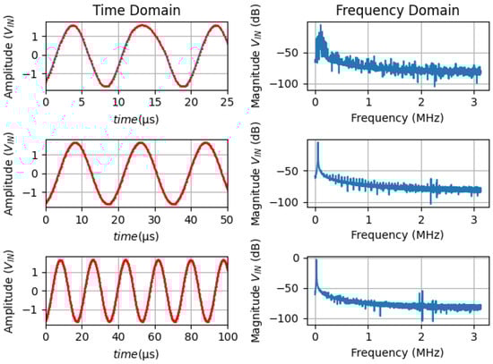 The designed system described in previous sections is capable of generating current signals dynamically depending on firmware configuration (Section 2.2) and passive components using just the on-chip peripherals present in the microcontroller. This section evaluates the resulting signal generated by sampling a known resistor as and acquiring the voltage signal present in . The current source implements and , 5% for testing. Recalling Equation (1) with the specific values provides