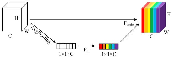 During the process of feature extraction, it is inevitable that some feature layers have a greater effect while others have a lesser one. The Squeeze–Excitation Block (SEBlock) is a method used to improve the ability of CNNs to represent features effectively. Its core idea is to recalibrate the relationships between channels through global information, thereby enhancing the network’s capacity to represent important features [37]. It introduces two steps, “Squeeze” and “Excitation”, for adaptively allocating weights to each channel’s features. Initially, in the “Squeeze” phase, the SEBlock compresses the spatial information of the feature map into a channel-wise descriptor via a global average pooling operation, capturing the essential information of each feature channel. Subsequently, in the “Excitation” phase, the SEBlock uses two fully connected layers to generate weights for each channel, reflecting the importance of each feature channel. These weights are then used to rescale the original feature maps, thereby highlighting key features while downplaying those less relevant. This enables the network to adaptively adjust the significance of each channel based on the input features, improving its capacity for feature representation. By capturing global contextual information and inter-channel dependencies, it significantly increases the network’s sensitivity and expressiveness towards crucial features.