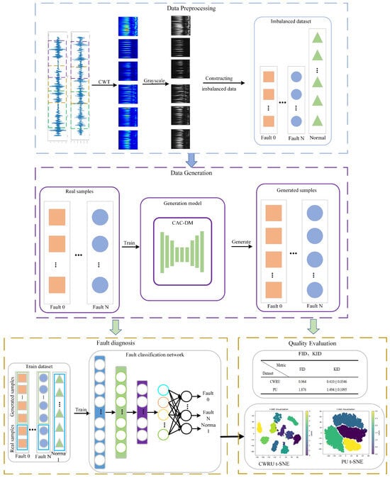 We first present the overall framework for fault diagnosis under the imbalanced data in Section 3.1. Then, the proposed CAC-DM is introduced in detail to effectively address the issue of imbalanced fault sample data in Section 3.2. Finally, we construct a three-layer convolutional neural network (CNN) to investigate the impact of generated samples on the classification performance of the fault diagnosis in Section 3.3.