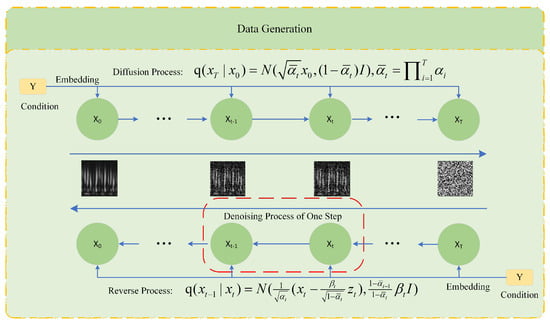 Diffusion models (DMs) [21] have developed rapidly, achieving significant results in the generative domain by generating high-quality samples through simulating the reverse process of the Markov chain [27]. DMs model the generation process as a probabilistic model and efficiently train it by optimizing the variational lower bound of the log-likelihood associated with the distribution of generated data. Researchers have conducted related studies based on DMs. Yang et al. [28] introduce a data augmentation method based on denoising diffusion probabilistic models (DDPMs) to address data imbalance in industrial equipment fault diagnosis, which generates samples through physical simulation, avoiding the instability and mode collapse issues common in GAN training. Cen et al. [29] propose an intelligent fault diagnosis method based on DM and a visual transformer (DM-OVT), which first applies short-time Fourier transform (STFT) to convert one-dimensional signals into time–frequency images, and then feeds them into the diffusion model to generate labeled fault data for different categories. Finally, the improved OVT is used to classify the augmented data. In addition, Wang et al. [30] propose an improved residual UNet diffusion model (IResUnet-DM) for bearing fault diagnosis under imbalanced data conditions, which optimizes the generated data distribution to closely match the real data, improving fault diagnosis accuracy under imbalanced conditions.