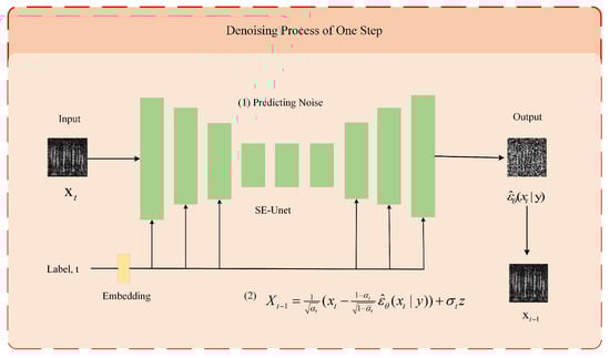 The sample augmentation process consists of two stages: model training and sample generation. As shown in Figure 5, grayscale time–frequency maps of fault data are used as the dataset. During the forward diffusion process, noise is progressively added to the samples at each step, transforming them into pure noise approximating a standard Gaussian distribution. As shown in Figure 6, the process of learning noise at each step of the reverse process involves the SE-UNet network, which learns the noise added during the forward diffusion process at each time step and gradually eliminates it in the reverse direction. Both the time step and condition (i.e., label information) are embedded into the features during training, enabling the model to learn conditional relationships and adapt the denoising process based on these inputs. This denoising process starts from pure noise and iteratively refines the sample until it resembles the original data distribution, ultimately generating a new sample. The training objective is to minimize the difference between the predicted noise and the actual noise by calculating the gradient of the loss function. Throughout this process, the model learns how to create realistic data samples from noise. Specifically, as illustrated in Figure 6, SE-UNet receives a noisy sample at each step, predicts the noise component, and produces a denoised output . This iterative denoising continues until the model reconstructs a final sample that aligns with the data distribution.