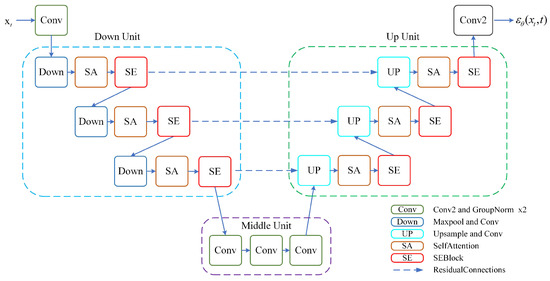 The detailed structure of the SE-UNet model is illustrated in Figure 7, which consists of five parts: input, downsampling, middle unit, upsampling, and output. Initially, the data are fed into a Conv block, which performs two convolutions and normalization operations. Next, three downsampling steps are executed, primarily utilizing Maxpooling operations, with a self-attention module integrated following each step. After downsampling, the process moves through the middle unit, which fuses high-level features from the downsampling units with low-level features from the upsampling units to further learn the sample information. The upsampling unit restores the feature mapping from low to high resolution, enhances the feature representation using a self-attention mechanism, and accepts residual connections from the downsampling layers. The final output yields the predicted noise, which is further processed accordingly. Notably, after each self-attention module, we add the SE (Squeeze–Excitation) module, which enhances the ability of the network to learn channel relationships. Our model introduces the channel attention mechanism to learn the importance of different feature channels, enhancing the model’s focus on key aspects. Combined with the self-attention module’s grasp of global information, our model learns hard-to-distinguish categorical information and fine-grained differences to generate better samples for subsequent tasks.