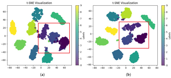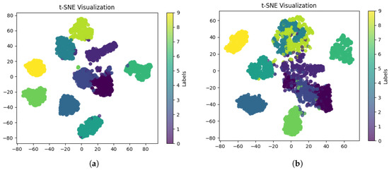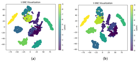 Table 4 lists the results of the CNN fault diagnosis method based on the CAC-DM and the four generated models. The bold indicates the best classification performance for each generated model. For the CDDPM, the sample generation quality and fault recognition rate surpass those of GANs. We also provide t-SNE visualizations of the features from datasets trained on the CNN using different methods, as shown in Figure 8. It is clear that the CDDPM performs better than GANs.