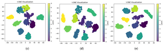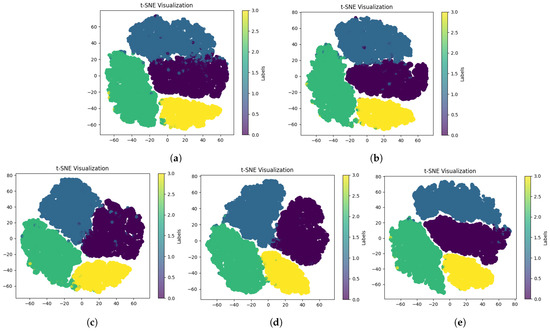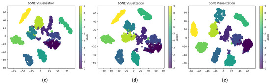 To verify the effectiveness of the proposed model in solving the problem of distribution of similar fault categories, we compare the performance of CAC-DM and CDDPM on partial indistinct label distribution on the CWRU dataset. First, the samples generated by the CDDPM model are incrementally mixed with the fault data to create different imbalanced ratios for the training dataset. Then, based on the analysis of the CNN results on the different training sets, we further compare the performance of the CAC-DM and CDDPM on the CWRU dataset for the indistinguishable categories 0, 1, and 2. Table 5 presents the experimental results under different imbalance ratios, where the first row represents the metrics without generated samples, followed by the measures of the samples gradually being added until the fault samples are balanced with the normal samples. With the reduction in class imbalance, the overall performance of the model is improved. As shown in Figure 9, t-SNE technology is used to visualize the features of the penultimate layer of the CNN model, where (a) to (e) represent the feature visualization under different imbalance ratios. It is clear that as the generated samples are gradually added to the training data, the boundaries between the different classes become more and more obvious.