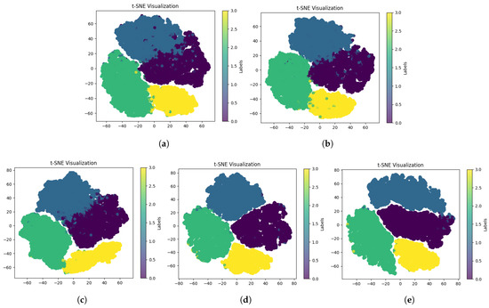 T-SNE feature visualization of different balance ratios: (a) 16.6:1; (b) 8.25:1; (c) 4:1; (d) 2:1; (e) 1:1.