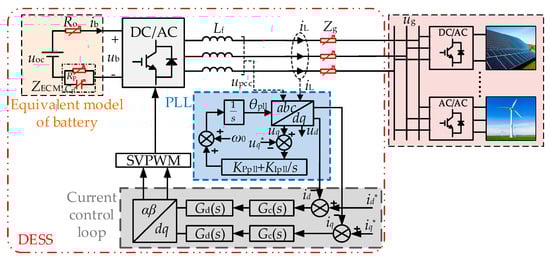 However, grid-connected DESSs have to face stability issues [6,7]. On the one hand, the distribution network is generally controlled by feeder line switching operations, which leads to the impedance variation in distribution networks. On the other hand, according to the electrochemical characteristics of batteries in DESSs, the internal resistance, storage capacity, and terminal voltage would be changed due to its aging and charging/discharging operations [8,9,10,11,12]. Impedance variation from both the DESS side and the distribution network side bring complex high nonlinearities to this grid-tied system and even fail the system. Since most commonly used DESSs are controlled by a current controller, the stability issue becomes a serious problem for further commercial use. Thus, it is necessary to study the instability mechanism of a grid-tied DESS and develop a compensation strategy accordingly to enhance the system’s stability.
