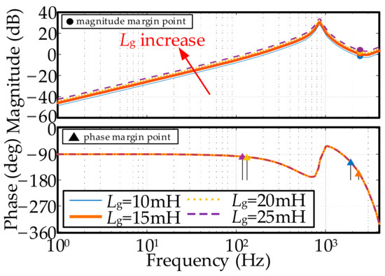 The Bode plots of sensitivity analysis between Zg(s)/ZGCI(s) and Lg are shown in Figure 3, where the increasing direction of Lg is indicated by the red solid arrow. In this figure, different coloured circles and triangles represent the magnitude margin points and phase margin points for different values of grid impedance Lg, respectively.