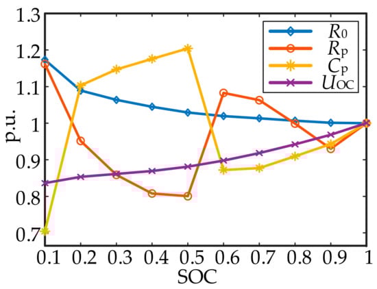 Meanwhile, the output characteristic of the DESS is influenced by the variation in the SOC during the charging and discharging process of the battery. Key parameters (such as UOC, R0, Rp, and Cp), explanations of which are listed in the appendix, cannot be ignored in such systems. The equivalent Thevenin model is adopted for the batteries in the DESS due to its simplicity and ability to accurately represent key dynamic characteristics, such as open-circuit voltage and internal impedance, under varying SOCs. Compared to more complex models, the Thevenin model provides sufficient accuracy for analyzing the system’s behavior while maintaining computational efficiency, making it ideal for real-time control and implementation in the proposed PLL compensation strategy. Combining the equivalent Thevenin model of batteries in the DESS shown in Figure 1 with the key parameters’ fitting function introduced in [39], the variation in key parameters versus the SOC can be found in Figure 4.