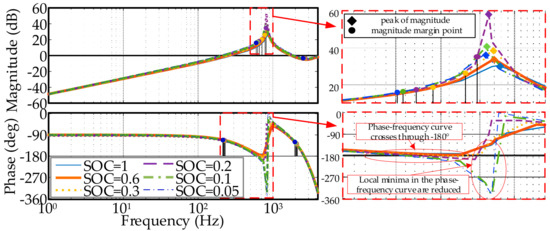 As shown in Figure 4, during the discharging process, the SOC drops from 1 to 0.1, uOC would be decreased, and R0 would be increased. The Bode plot of impedance ratios under different SOCs is given in Figure 5. In this figure, different colored circles and triangles represent the magnitude margin points and phase margin points at different SOC of the battery, respectively. The diamond symbols represent the peak points of amplitude characteristics at different SOC. As shown in the figure, as the SOC decreases, the peak value of the amplitude–frequency characteristic curve would be significantly changed and the local minimum value of the phase–frequency response curve would be decreased. When the SOC is lower than 0.3 p.u., the frequency that the phase–frequency response curve rides through −180° comes ahead and the gain margin of the system is below 0. In this case, the DESS brings negative efforts to the system’s stability.