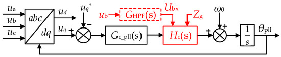 In order to enhance the stability of a grid-connected DESS, an improved PLL strategy is proposed and is shown in Figure 6. As shown in the figure, compared with a traditional PLL, a compensation link Hc(s) is employed in the proposed structure, by which the impedance on the q-axis of the DESS can be compensated to improve the system’s stability. Moreover, in order to deal with global impedance changes for the concerned grid-connected system, Hc(s) is adaptively adjusted according to both the impedance of the distribution network and the impedance of the DESS. Since the impedance of the DESS relates to the RMS value output voltage ripple Ubx, Ubx is employed to reflect the impedance of the DESS and can be obtained by a high-pass filter GHPF(s) with the measured transient voltage of the DESS inverter ub.