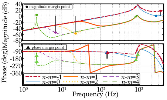 Referring to Hc(s) shown in (11), compared with the highest order term of the denominator, other terms with high order are relatively small and can thus be ignored for instability analysis. Thus, the effort of Hc(s) can be categorized as three situations: n − m < 0, n − m = 0, and n − m > 0, the curves of which are shown in Figure 7. Different colored circles and triangles represent the magnitude margin points and phase margin points with different n-m, respectively.
