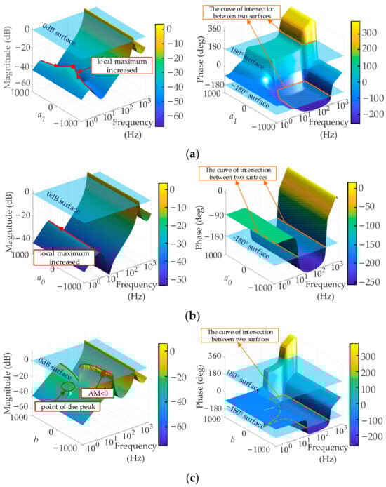 It is clear that a1, a0, and b are key parameters that affect the system’s stability. By taking one of the parameters as variable, the effects of every parameter on the impedance ratio of the DESS can be obtained as in Figure 8, where the semi-transparent planes represent 0 dB in the magnitude–frequency analysis and ±180° in the phase–frequency analysis.