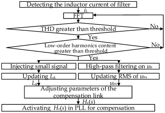When the DESS is connected to the distribution network, the grid current iL is detected and the THD value of the grid current is obtained by fast Fourier Transform (FFT). Then, by comparing the obtained THD with a threshold value, the controller decides whether to activate further comparison. If the THD is higher than the threshold, the fundamental component and the second–seventh harmonic components will be updated and further compared with the corresponding preset threshold. If the harmonic component is higher than the corresponding threshold, it means that there is an eigenvalue of low-level harmonic oscillation, which might lead to an unavoidable risk of destabilization. Thus, it is time to activate the compensation link. Thereafter, the detected and calculated Lg and ubx are applied to adjust the parameters in the compensation link HC(s), which will be activated in the PLL and the current control loop for compensation.