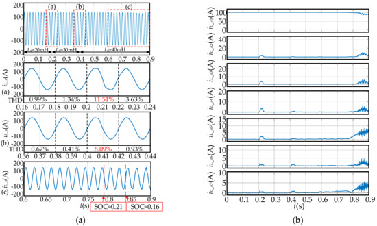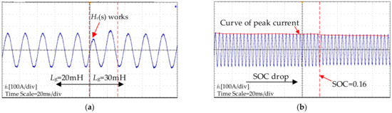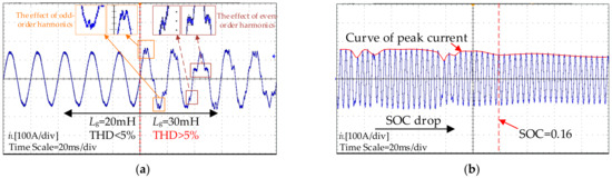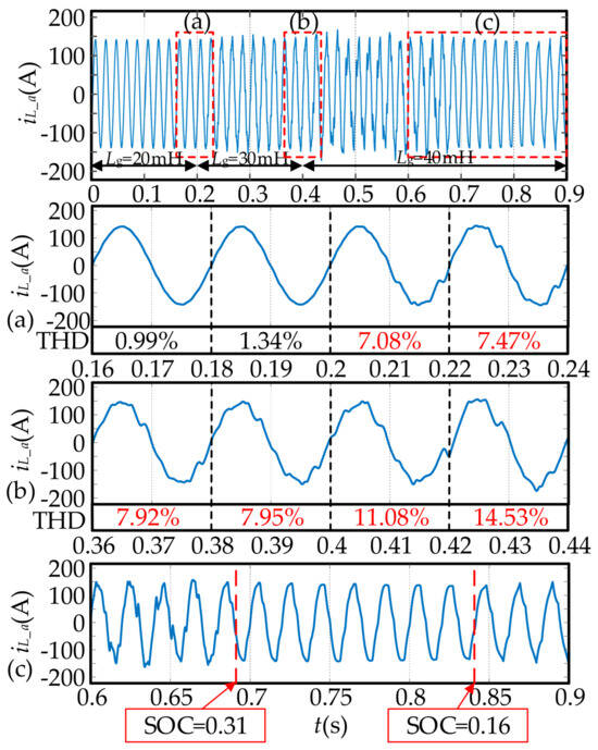 As shown in Figure 17a, without the proposed compensation link, the low-order harmonics of current iL with high amplitude can be immediately detected. Figure 17a highlights the distortion caused by odd harmonics, which leads to sharp peaks and valleys, and even harmonics, which induces waveform asymmetry. The current waveform is evidently distorted with a THD > 5%, and the system operates with instability. In Figure 17b, the impedance variation in the DESS is emulated by reducing the SOC. The impedance as well as the terminal voltage of the DESS are changed, which causes unstable variation in current iL. As the SOC is decreased to 0.16, it can no longer support the grid-tied system, and the amplitude of iL suffers attenuation and a small fluctuation.