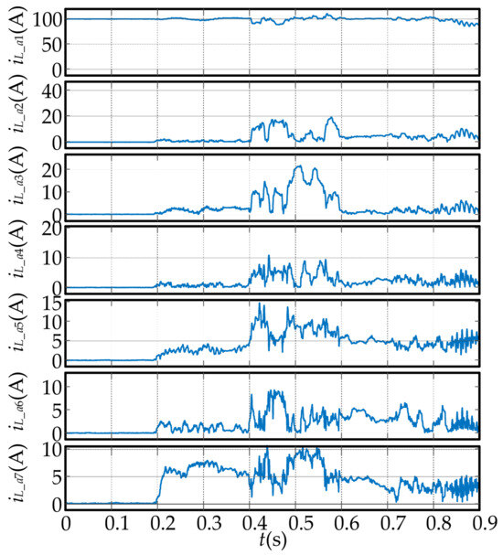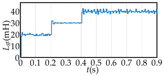 In the proposed compensation strategy, the grid impedance is timely measured by the high-frequency signal injection method. The injected small-signal, with a frequency of 670 Hz, is used to detect grid impedance and evaluate the system’s response to controlled disturbances. The real-time measured grid impedance is shown in Figure 13. It can be seen that the grid impedance can be correctly detected under different operating conditions of the distribution network.