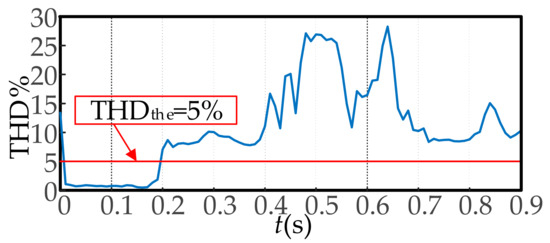 Figure 10, Figure 11 and Figure 12 show time-domain waveforms, related harmonic components, and the THD of the output current of the DESS without a compensation link, respectively. In Figure 10, regions a and b are defined based on the change in grid impedance. In region a, grid impedance changes from 20 mH to 30 mH at 0.2 s; in region b, grid impedance changes from 20 mH to 40 mH at 0.4 s. This progression reflects typical grid conditions that the proposed strategy is designed to address. As shown in Figure 10, during 0~0.2 s (the grid impedance is 20 mH), the DESS is discharged and the discharging current flows to the distribution network via a short transient stage; during 0.2~0.4 s (the grid impedance is increased to 30 mH), the THD of the grid current exceeds 5%, which is marked as the threshold. The RMS value of the lower-order harmonic component is also increased significantly. According to the previous theoretical analysis, it can be seen that the stability of the grid-tied DESS might have deteriorated. During 0.4~0.9 s, the grid impedance is increased to 40 mH, the THD of the output current is further increased, and the harmonic components of the current spectrum are also significantly enlarged. The phase of the output current is slightly shifted and the current amplitude undergoes unexpected oscillation, which reveals the instability of the grid-tied DESS caused by impedance fluctuations from the grid side.