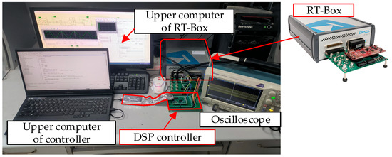 To validate the effectiveness of the proposed PLL compensation strategy, a hardware-in-the-loop (HIL) experimental platform was established, the photograph of which is shown in Figure 16. The HIL system utilizes an RT-Box real-time simulator that is employed to emulate the dynamic behavior of a grid-tied DESS, and a TMS320F28335 digital signal processor (DSP) is employed to implement the proposed strategy. The RT-Box executes a high-fidelity DESS model designed in the PLECS environment, including grid impedance, inverter, and battery characteristics. The model operates with a simulation step size of 10 μs, ensuring precise real-time emulation of grid dynamics. The sampling period of the DSP is set to 50 kHz. A 10 kHz control signal, which includes a phase adjustment and modulation index, is generated by the DSP and transmitted to the RT-Box via a high-speed communication interface. This configuration enables accurate evaluation of the compensation strategy under various disturbance scenarios.