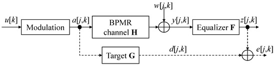 After the received signal is fed to equalizer F, the output z[j,k] is given by: