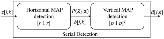Using Equations (4) and (5), we derive two detection branches: the first branch performs inner detection, processing the received signal in the horizontal direction, while the second branch performs outer detection, handling the signal in the vertical direction, as illustrated in Figure 2. These equations produce 216 values, which we denote as Zi for i = 1, 2, …, 216.