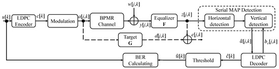 In Figure 5, firstly, u[k] is the original data and encoded into c[k] . To store the data on the BPMR channel, c[k] is arranged row by row and modulated into a[j,k] in the media of BPMR. In this study, the modulation scheme is similar to binary phase shift keying (BPSK) used in communication systems. A 0-bit is mapped to the negative pole of the magnet and represented as −1, whereas a 1-bit is mapped to the positive pole of the magnet and represented as +1. The output of BPMR channel is fed to equalizer F to obtain the signal z[j,k]. Then, the serial MAP detection detects z[j,k] and inputs [j,k] to the LDPC decoder. Here, we can use sum–product algorithm or GNN as operation function in LDPC decoder. The output of the decoder is processed to create extrinsic information feedback to vertical detection in serial MAP detection. Finally, after v-th iterative loops, the output [k] of LDPC decoder is converted into binary [k] and compare with original signal u[k] to calculate BER performance.