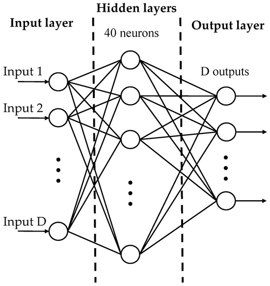 In Figure 7, the structure of MLP in GNN is presented. There are three layers: input layer with D = 20 inputs, hidden player with 40 neurons and output layer with D outputs. We used the “tanh” function as the activation function in MLP.