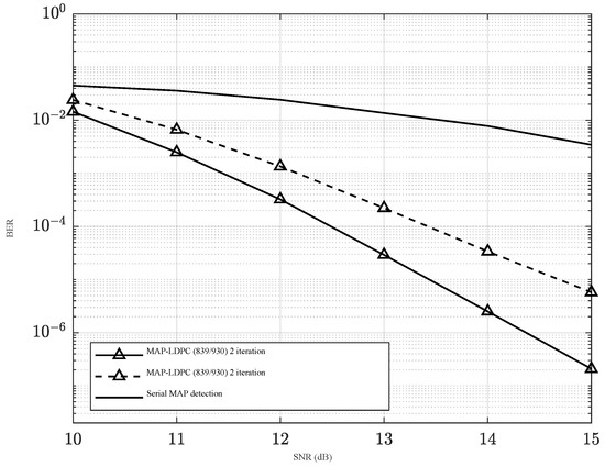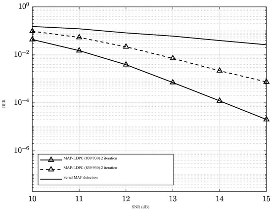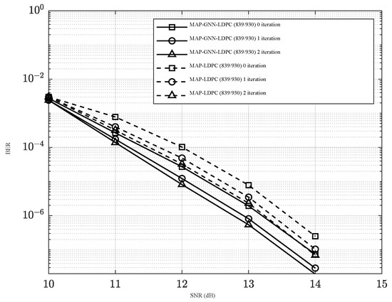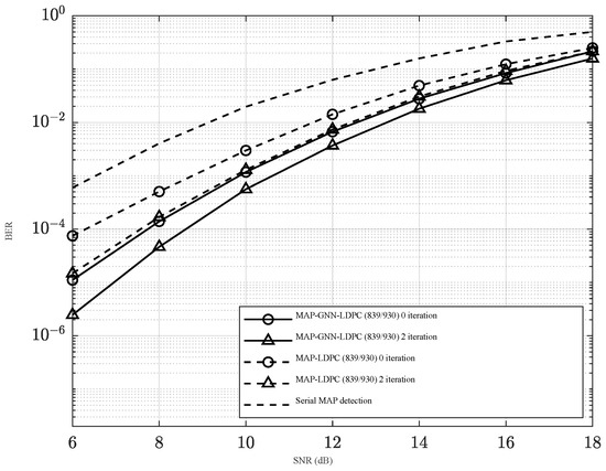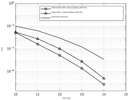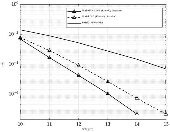 In Figure 10, feedback was added between detection and decoding. With feedback, the proposed model achieves better performance compared to the forward-only model. In the feedback model, we used the probability supplied by LDPC or GNN–LDPC to estimate the probability of symbol R in vertical MAP detection, serving as extrinsic information. It is evident that performance remains unchanged after the second iteration, so the process was terminated at this point. The performance of both MAP–LDPC and MAP–GNN–LDPC improves when feedback from the decoder to the detector is incorporated. This suggests that extrinsic information is more effectively utilized, enhancing the effectiveness of the MAP algorithm. Furthermore, as mentioned earlier, the performance of LDPC after three iterations is comparable to that of GNN–LDPC without feedback. This confirms that GNN can exploit information on the bipartite graph more efficiently than the sum–product algorithm.