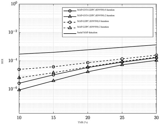 In the first experiment, we compared serial MAP detection without the LDPC decoder, MAP–LDPC without feedback, MAP–LDPC with feedback, MAP–GNN–LDPC without feedback, and MAP–GNN–LDPC with feedback. The outcomes of this experiment are shown in Figure 8.