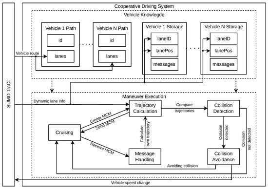 The Cooperative Driving System (highlighted in blue) is the primary component developed within the MCS. It is mainly used to store essential data and orchestrate the entire maneuver coordination process. By zooming into this subsystem, Figure 2 demonstrates how the Cooperative Driving System operates in alignment with the broader system architecture shown in Figure 1. This component is divided into the Vehicle Knowledge and Maneuver Execution modules. The Vehicle Knowledge module contains all relevant vehicle information for the MCS implementation. Here, each vehicle stores its path (obtained at the beginning of the simulation) and the most recently received and transmitted MCMs. The Maneuver Execution module comprises five states corresponding to each vehicle’s phase in maneuver execution: Cruising, Message Handling, Trajectory Calculation, Collision Detection, and Collision Avoidance. Cooperative maneuvers require vehicles to progress through these states before execution. Figure 2 illustrates the different states and transitions between them.