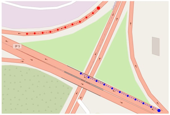 In order to define the future trajectory to be included in an MCM, various challenges related to SUMO were encountered, particularly in the acquisition of vehicles’ route data for the scenario, requiring extensive research. SUMO provides complete route information for all vehicles in the *.rou.xml file, which contains the predefined paths that each vehicle follows throughout the simulation. This eliminates the need for a custom path planning algorithm, as the vehicle routes are already available and ready to be used directly in the simulation. Firstly, it was defined that a trajectory is formed by ten intermediate points at intervals of 0.5 s, resulting in a total of 5 s of future trajectory. The primary challenges lay in acquiring information about the vehicles’ routes, particularly of (curved) road shapes, as well as future trajectories.